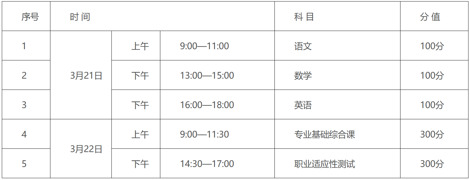 (2)公共基础课:报考本科层次的考生,或报考专科层次并选择综合类录取方式的考生,考语文、数学、英语3门科目;报考专科层次并选择技能类录取方式的考生,根据专业特点考语文、数学(或英语)2门科目。每门科目满分100分,考试时间120分钟。
