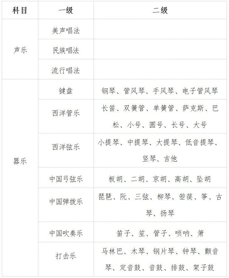 答:报考音乐类声乐考试科目的考生,须选择1种声乐唱法进行报考;报考音乐类器乐考试科目的考生,须选择1种乐器种类进行报考。具体声乐唱法和乐器种类详见下表:
