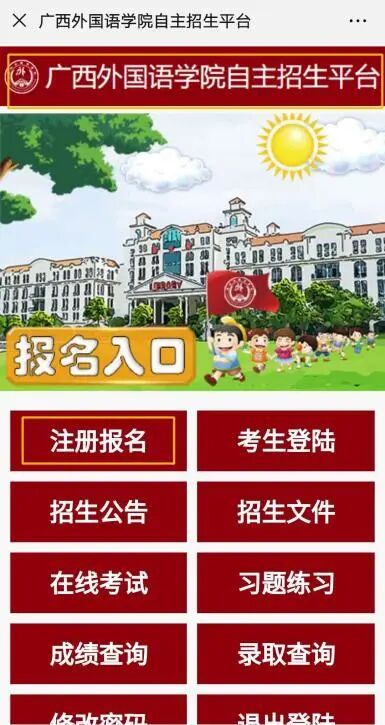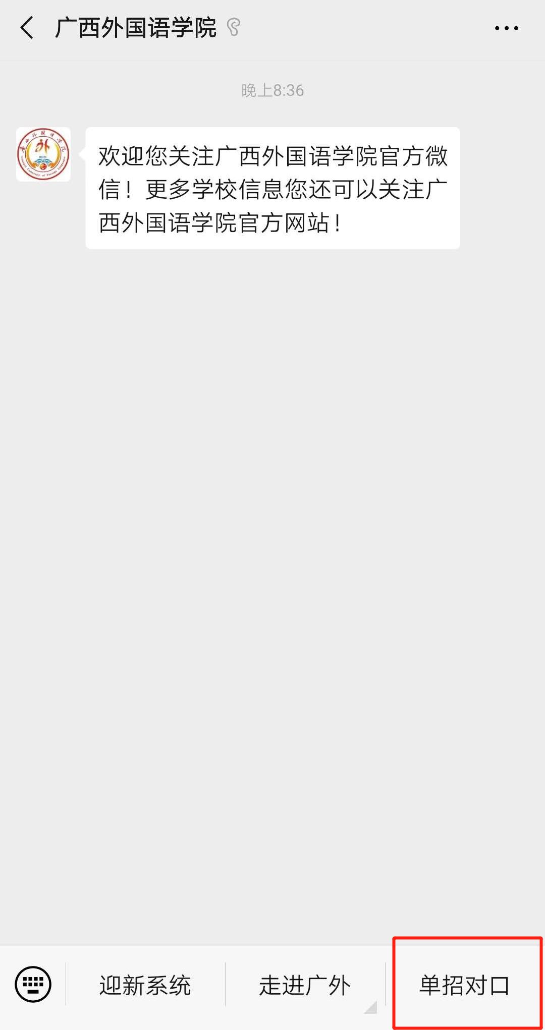 进入公众号主页面,点击右下角‘’单招对口‘’,进入广西外国语学院自主招生平台。