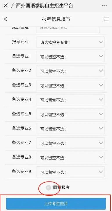 按顺序填写报名信息,填写完毕后勾选“同意报考”并上传考生照片,完成报名。