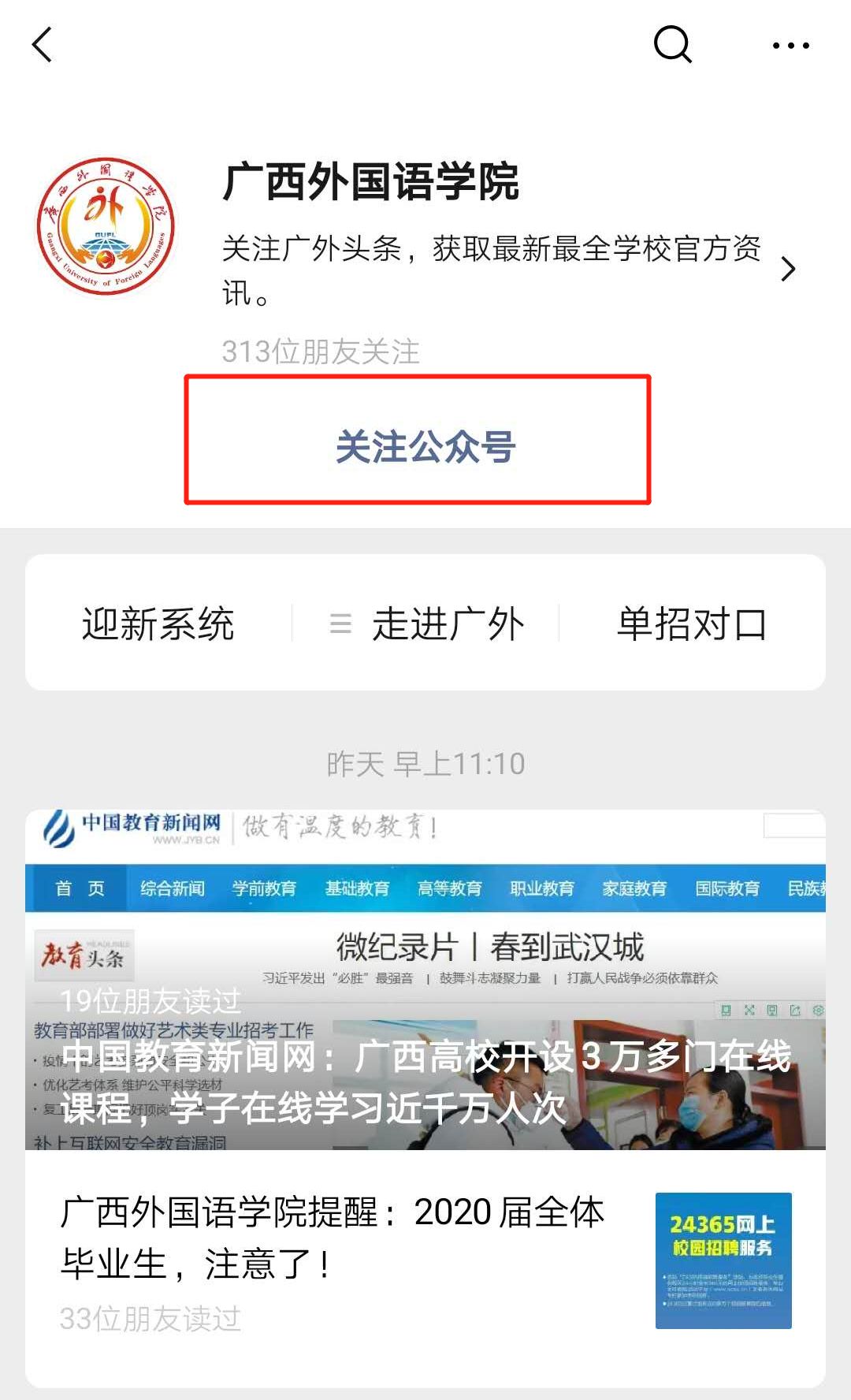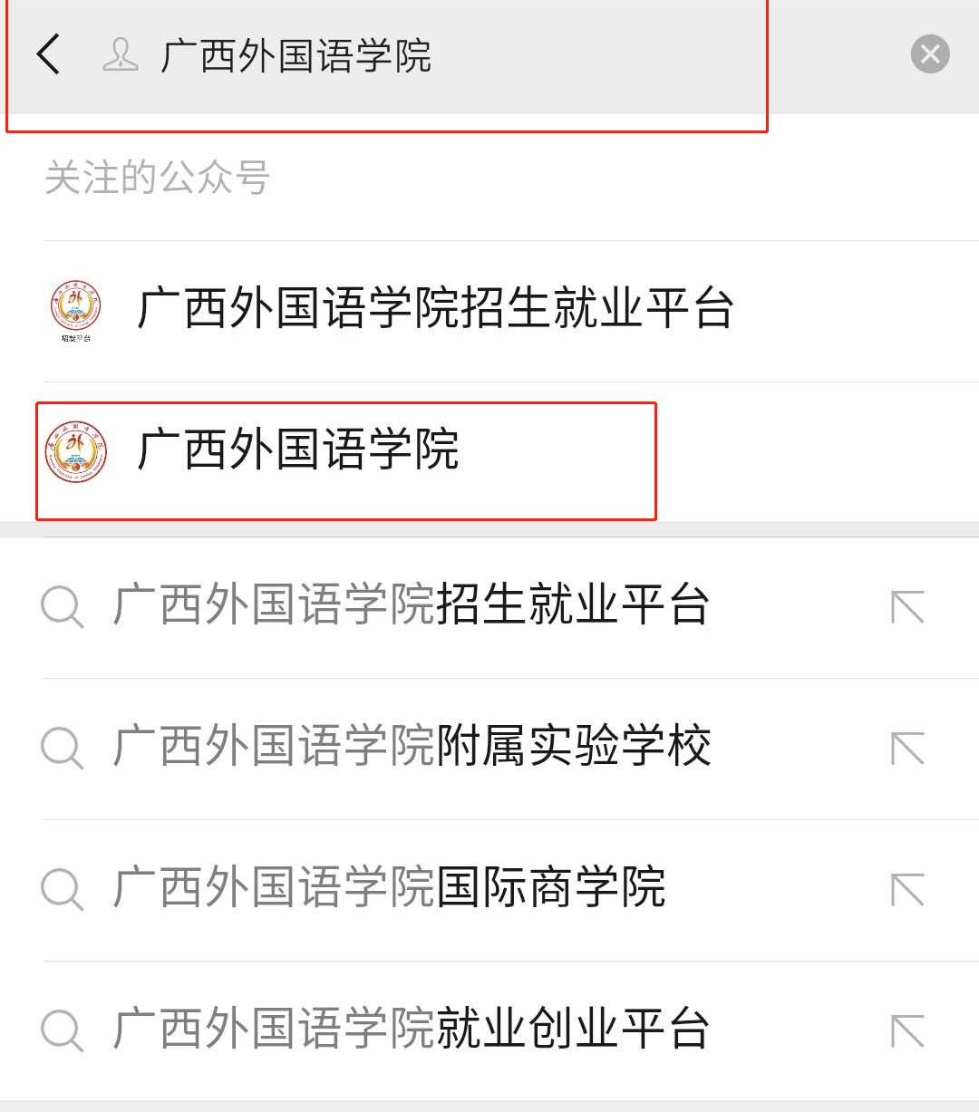 在手机端进行2020年广西外国语学院中职对口招生报名,首先搜索微信公众号“广西外国语学院”并关注。